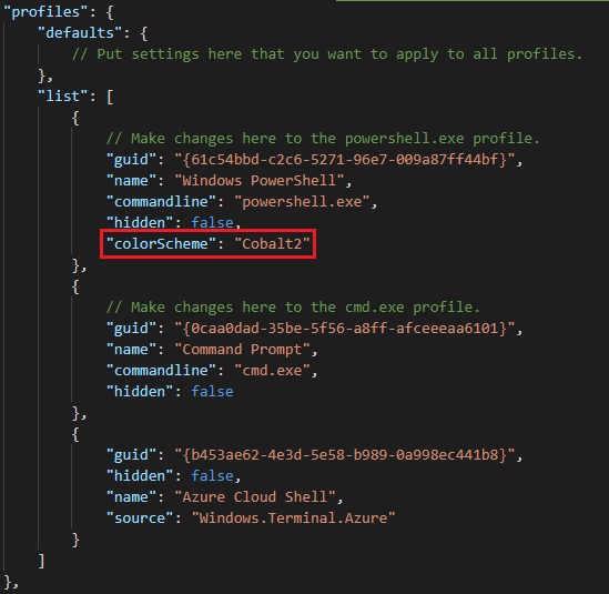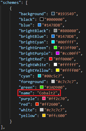 Take note of what is in the red box, which is the name for this scheme. Initially I glossed right over it and was wondering "how do I pair this to my specific shell?". A minute later I realised it was there and that using this name you can throw it against a shell using the "colorScheme" property and the name of the scheme: