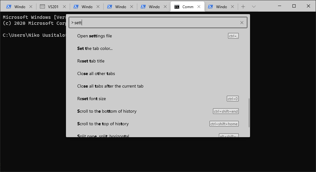 One of my favourite bits about Visual Studio Code is the Command Palette. I just have to roughly know what command I'm looking for and I'll be able to search it. Turns out, that is also a feature in the Windows Terminal! We've come so far.