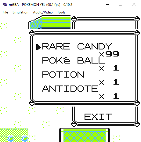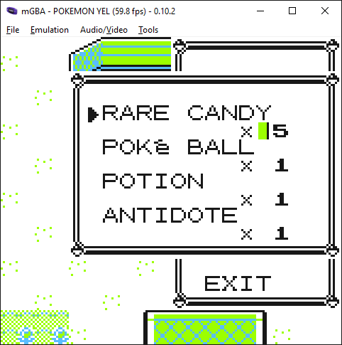 Get the game running as usual in mGBA and make sure the item you want to be turned into a rare candy is in the first slot. In Pokémon Yellow you can rearrange your bag by using the SELECT button. For this example, I will be using a paralyze heal.