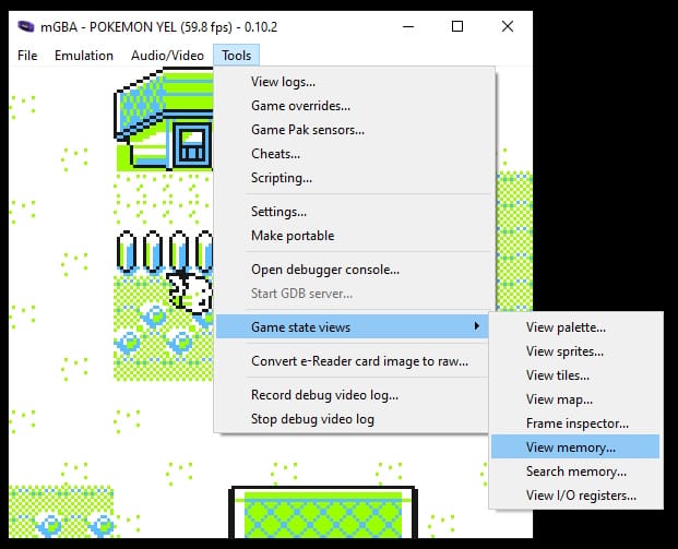 .sav file, so you'll be fine!In mGBA, go to Tools > Game state views > View Memory. This brings up the memory window.