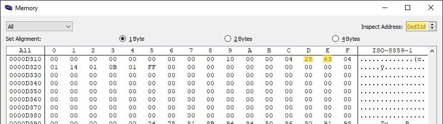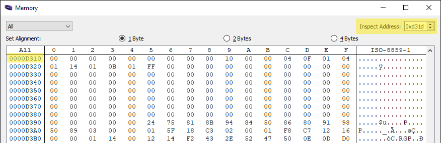 In the top right where it says "Inspect address" make it: 0xD31D. This takes us to row 0000D310 in memory where the bag begins.