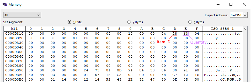 Now we'll be modifying the contents of your bag. To do this, we'll be using the memory window to change two numbers. The first number is the item ID and the second is the quantity.
