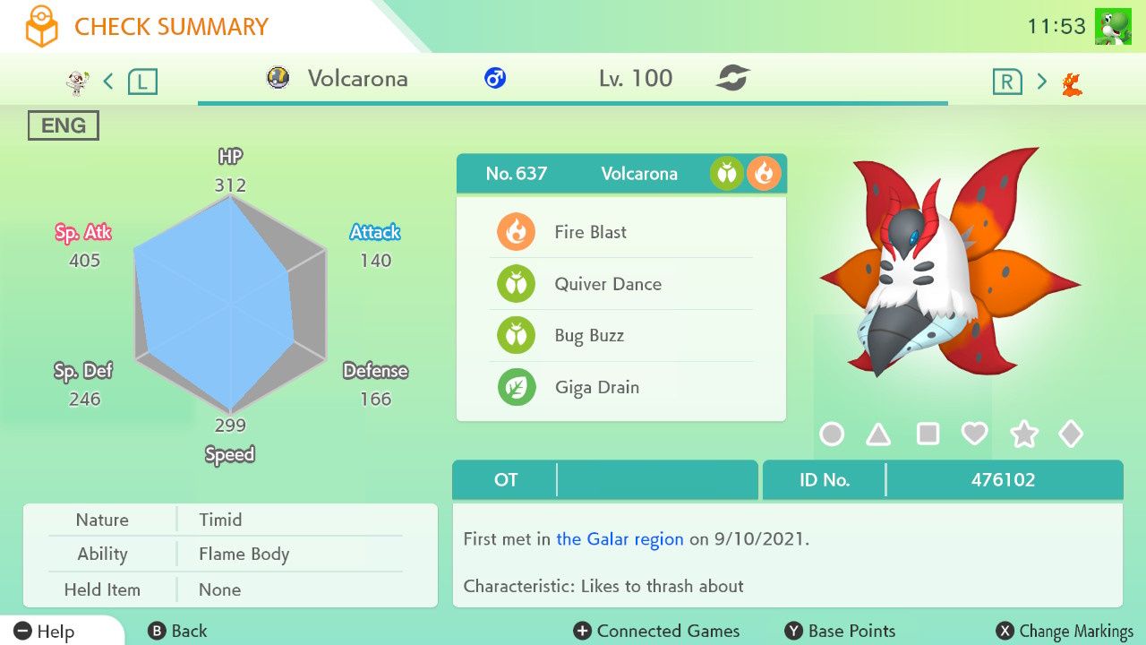 Since Gen 6 I've also really wanted to snag a Volcarona as my egg hatcher as it can have the ability Flame Body to hatch eggs faster. Meaning after thousands of eggs, my hatching hero Slugma will be retired to a special box in Pokémon Home. That is... Assuming I'll be able to use my Volcarona in future games... (I guess that goes for Slugma too 🤔).