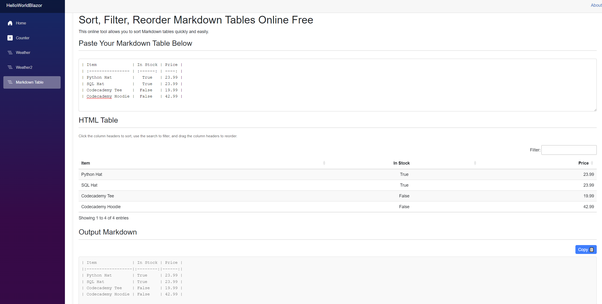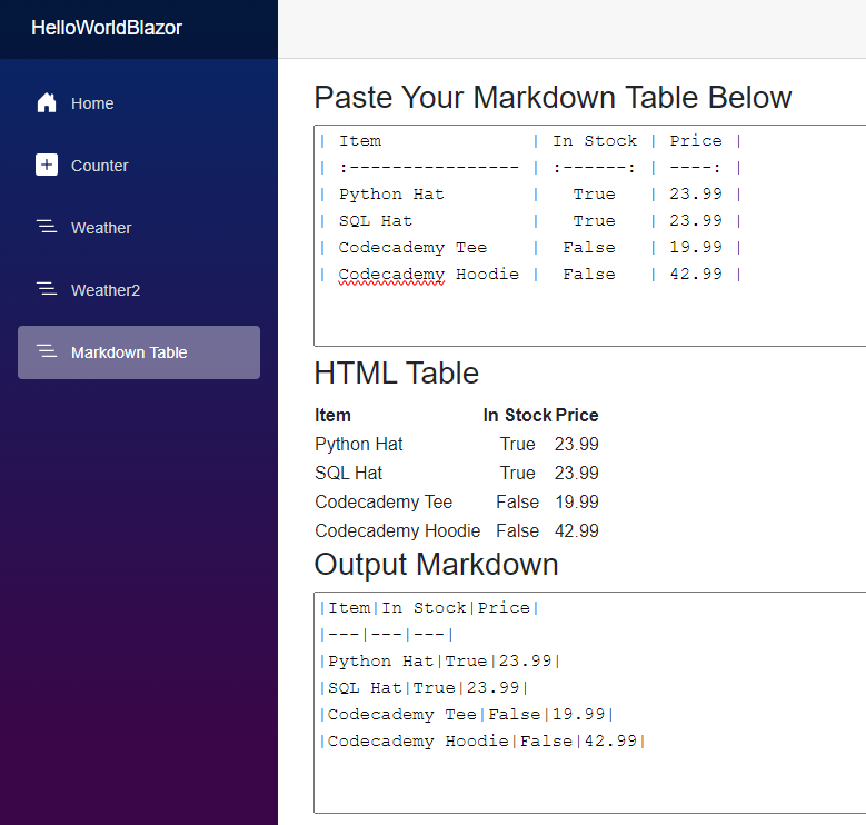 This was the longest part of development. I wanted to use a JavaScript table library that made changes to the DOM then the Blazor code picking that up and using C# to convert the table to markdown.