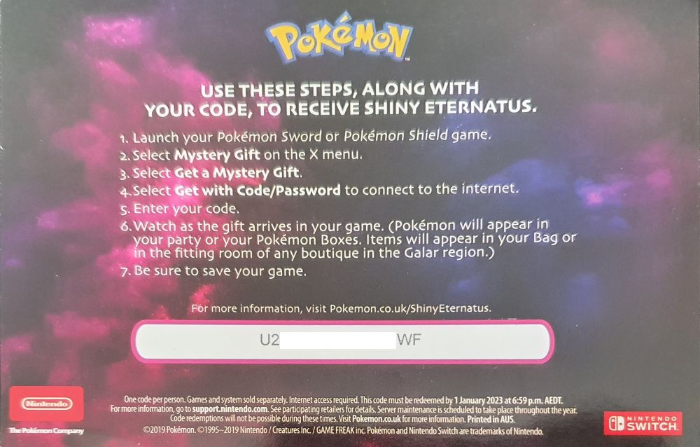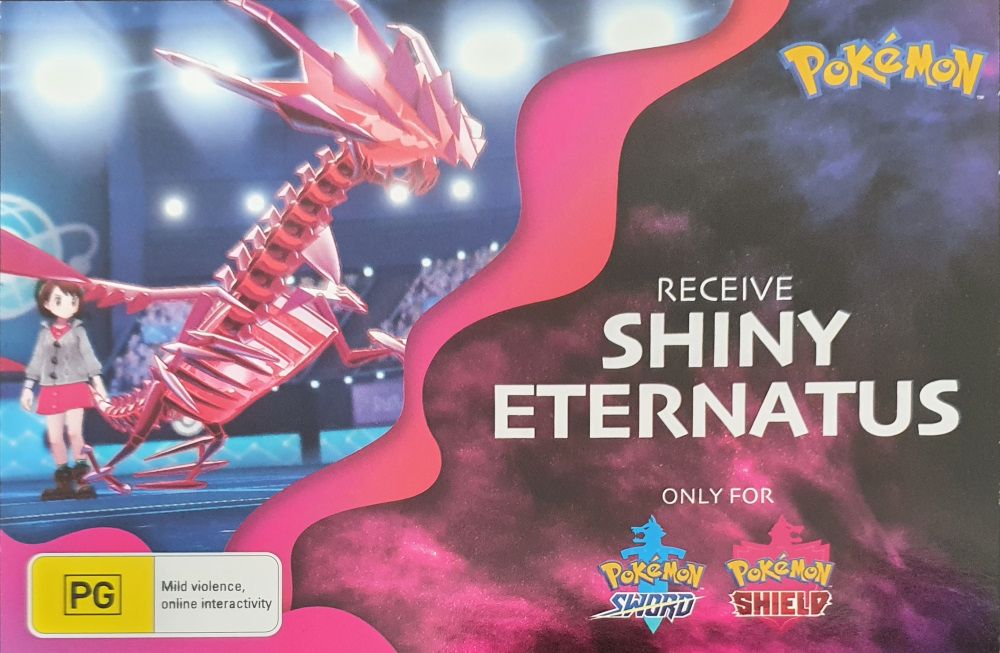 After my friend called ahead to confirm the availability, I went to my local EB Games and asked at the counter for the shiny Eternatus code and received a nice shiny piece of cardboard: