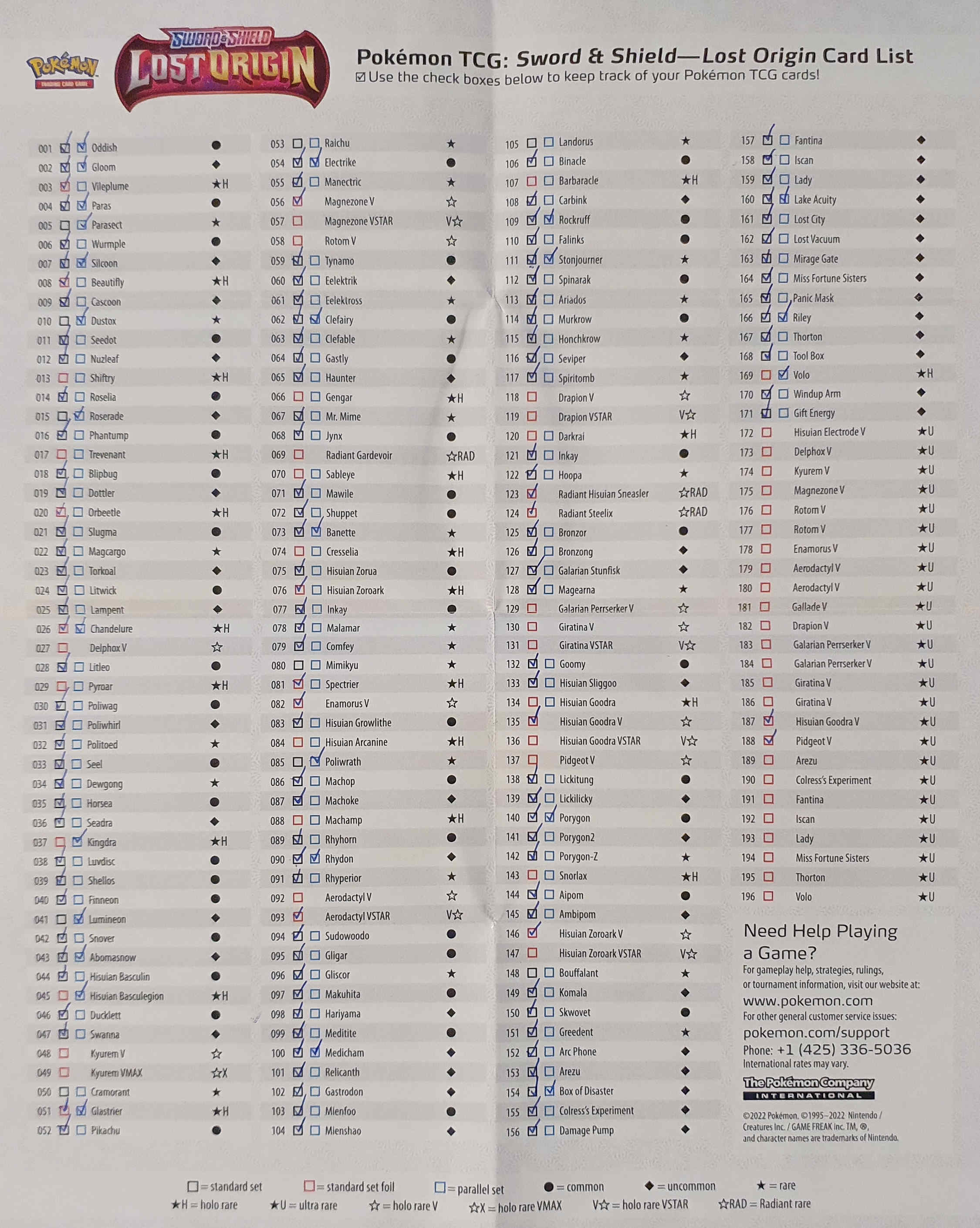 This is the record of all the different pulls from a Pokémon TCG Lost Origin booster box containing 36 boosters.